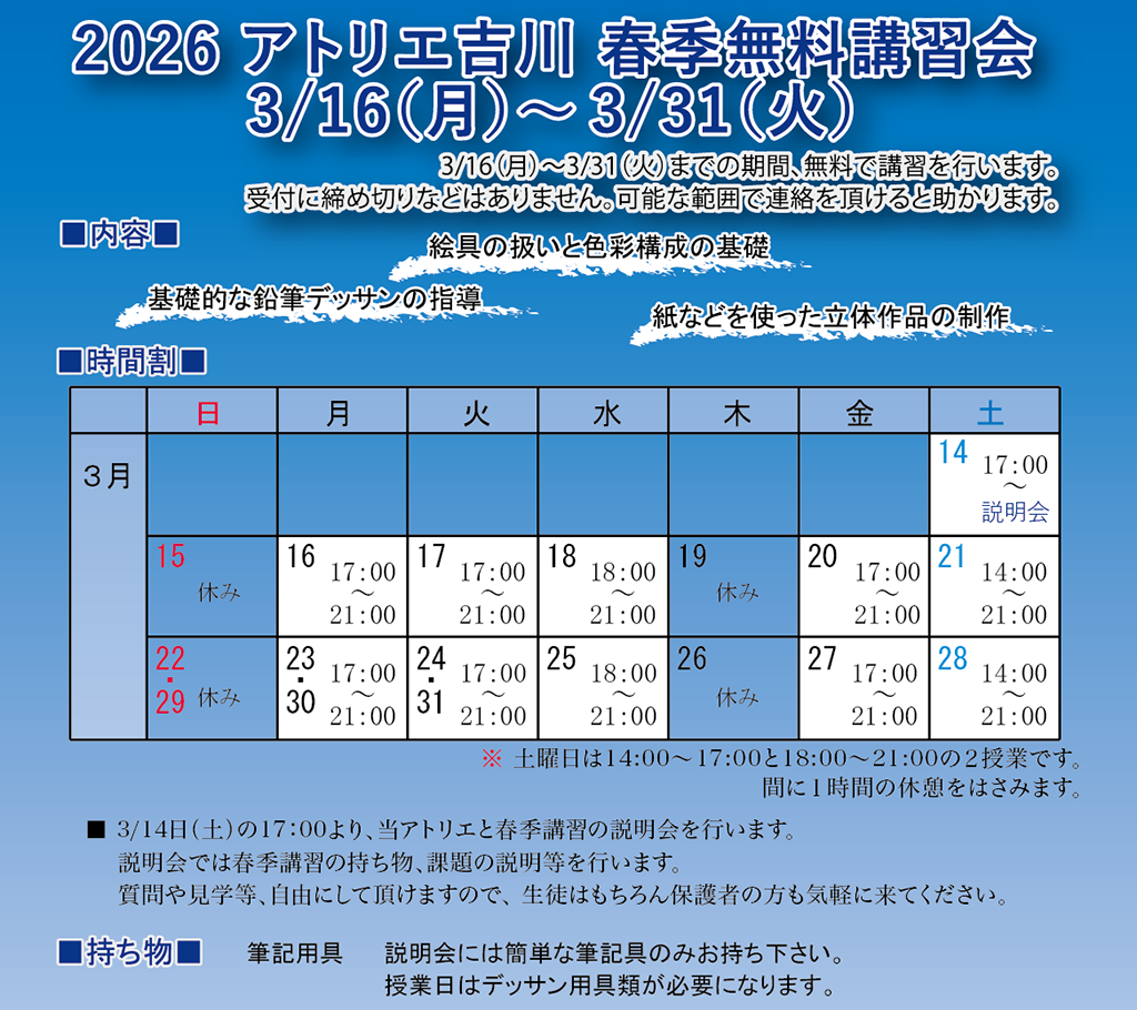 当アトリエと講習の説明会を3/14(土)の17:00より行います。